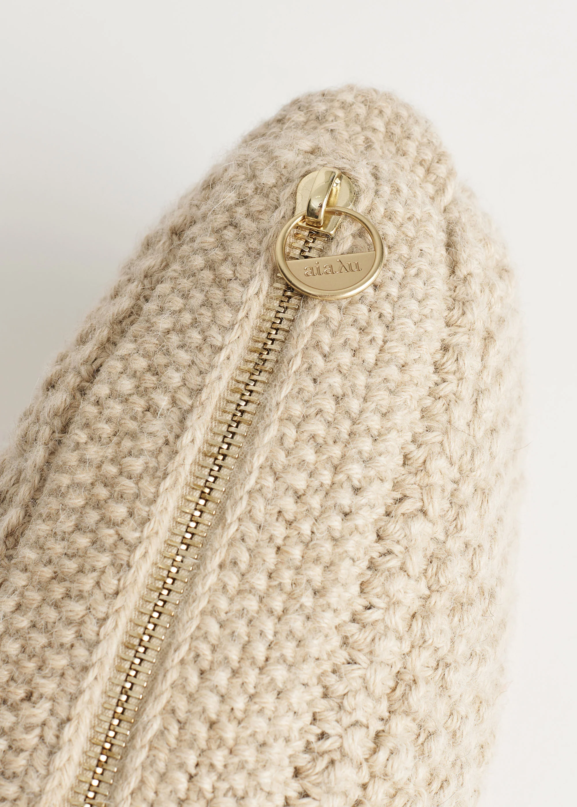 A hand-knitted clutch, made with love in Bolivia from the softest llama wool. Fully lined with practical details such as an interior pocket and zip closures. Designed in a beautiful bubble knit with a detachable chain that adds a distinctive expression and versatile use. Each handmade bag is signed on the lining with the embroidered initials of the woman who knitted it carrying her spirit and the essence of traditional craftsmanship.