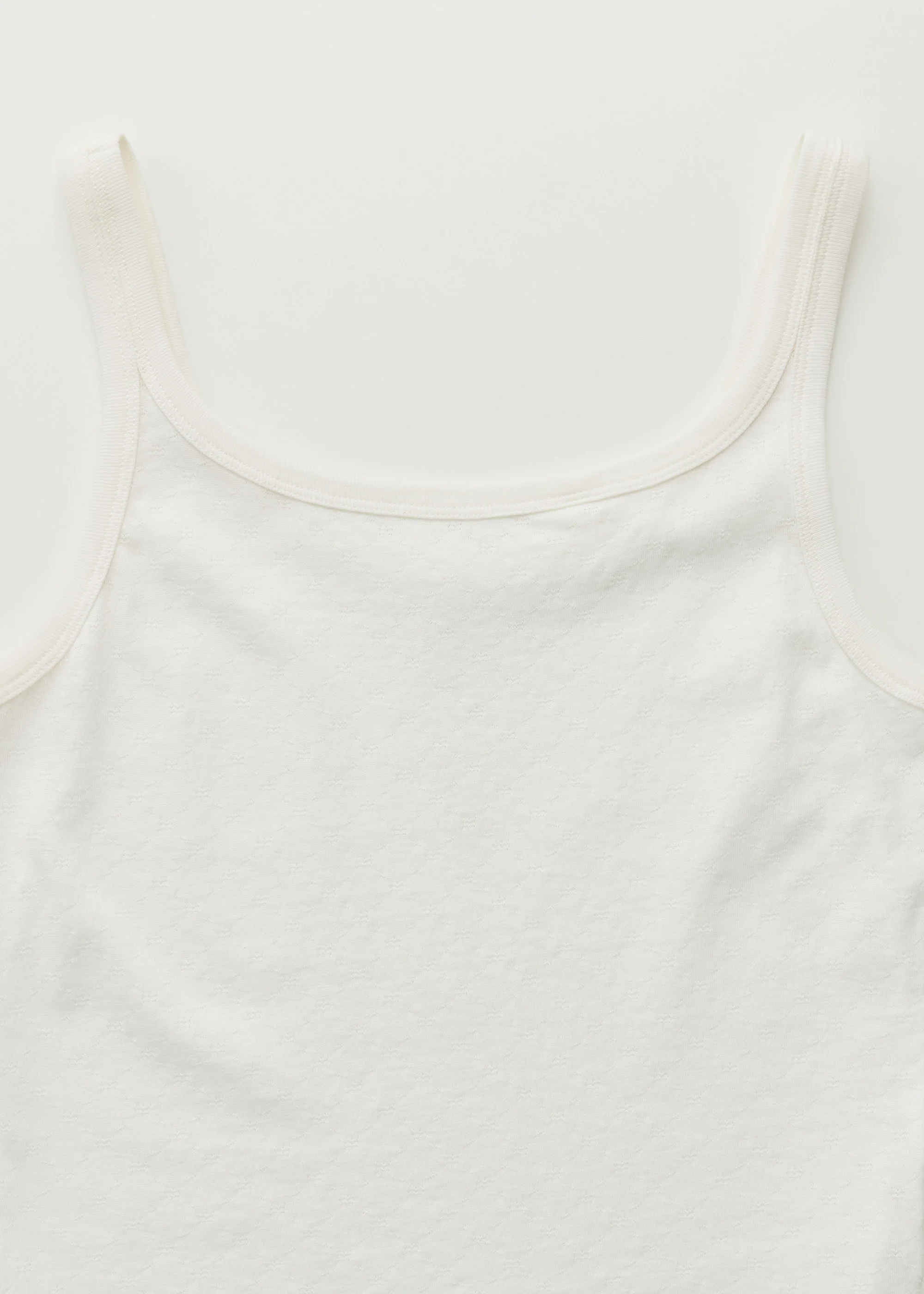 A classic tank top made from a light pointelle-inspired mesh jersey, offering a delicate and detailed look. It features a decorative bow detail at the front, with ribbed edges at the neckline and shoulders. The slim fit design creates an elegant, feminine silhouette.