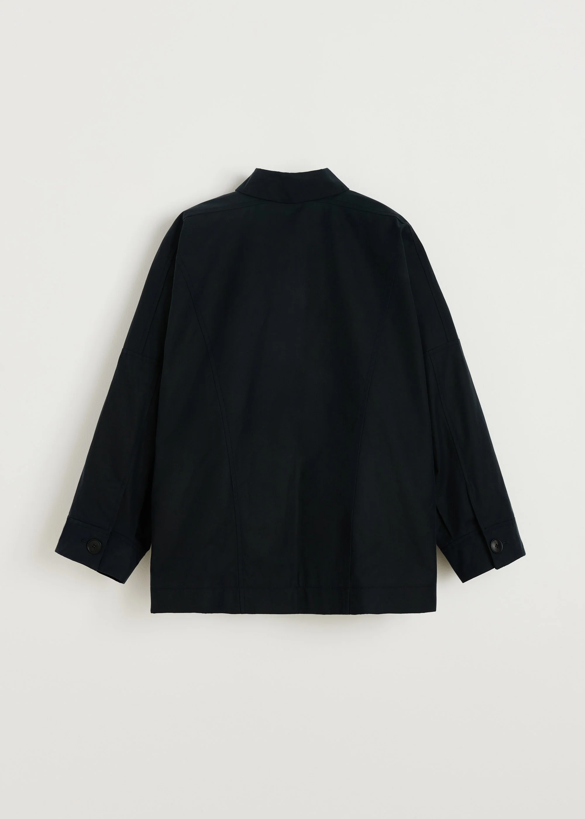 A short Oilskin jacket made from organic cotton with a natural coating. Designedin a relaxed fit with a hunting-inspired silhouette, featuring handmade horn buttons and characteristic checkered lining. Please note that, due to treatment with natural olive oil and without any chemicals, the jacket may have a slight scent upon receipt. This scent will gradually fade over time.