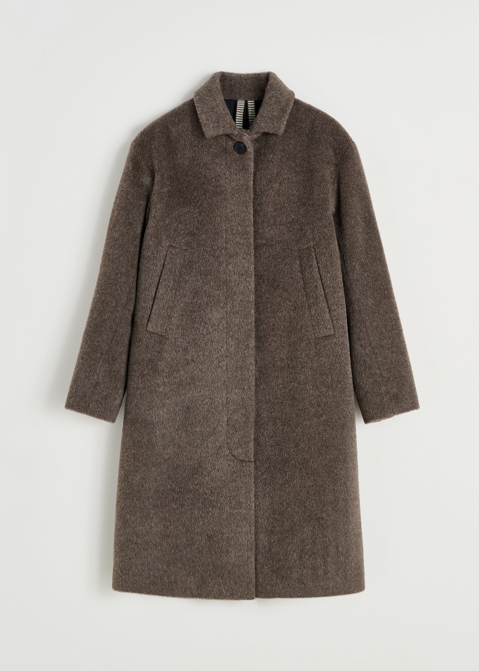A classic coat crafted from an exclusive blend of llama and merino wool. Designed with a regular silhouette, smooth lining, delicate collar, hidden button closure, and practical side pockets for an elegant, refined look. This unique wool blend provides a soft, tactile finish and exceptional warmth, with the natural water-repellent properties of llama fibers.