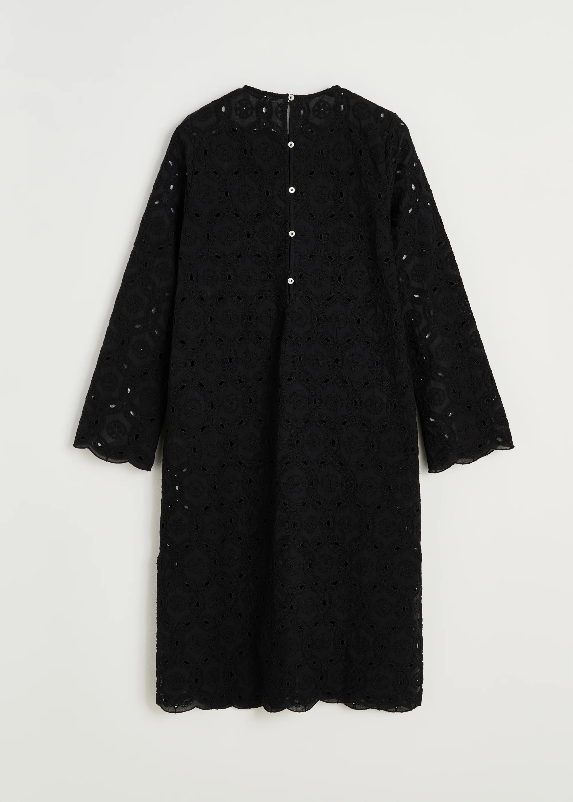 An elegant dress crafted from heavy, organic cotton in a flattering material. Designed in a straight fit with a voluminous drape and unique broderie anglaise pattern, creating a transparent look. Finished with delicate back buttons and long sleeves with a curved edge. Please note: A full slip is not included.